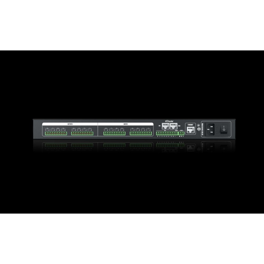 | Conexiones de salida | Phoenix (3.81mm) / RJ45 (Dante) |