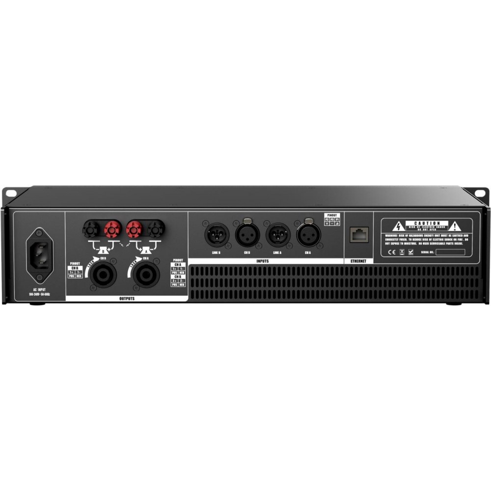 Impedancia Entrada: =20kO(Balanced);=10kO(Unbalanced). Tensión máxima de entrada: =22dBu. Ganancia: 32dBu